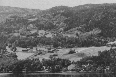 Øverskogen sett fra Toverud. Ned til venstre «Brygga» hvor D/S Ringerike la til. Over Brevikgårder, lenger opp Fuglerudgårder. Til høyre Tømte. Øverst til venstre Røynegårder.