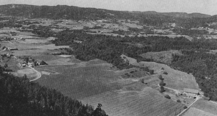 Kittilsrud. Nuven til høyre, Skauengårdene til venstre. I bakgrunnen Vestsiden med Sjåstad.